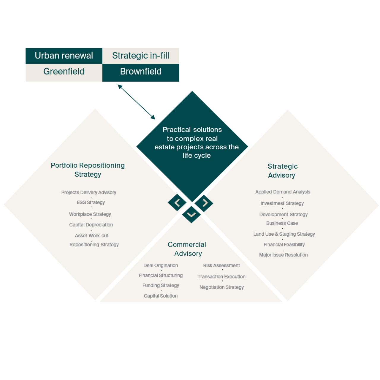 We offer three core pillars across Strategic, Commercial and Portfolio Repositioning Advisory, underpinning a holistic approach to delivering bespoke project solutions across the lifecycle.